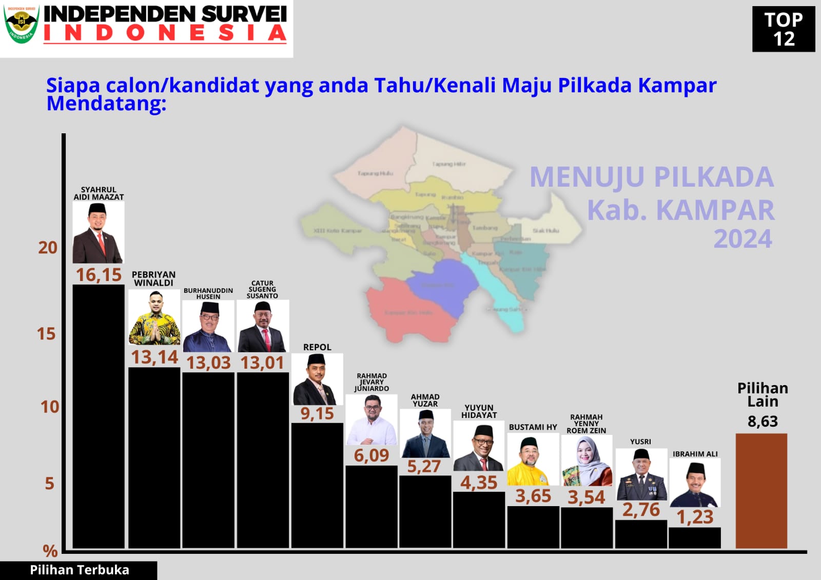 "Hasil survei terhadap beberapa tokoh bakal calon bupati soal popularitas sebagai bakal calon bupati Kampar, nama Syahrul Aidi, Pebriyan Winaldi dan Burhanuddin saling terpaut tipis dan bersaing ketat" ujar Peneliti ISI Randi Purnomo, Selasa sore (25/6).